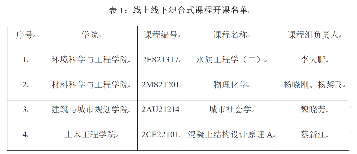 我校此次线上线下混合式课程大纲经专家审核,以下负责人承担的课程获准开展线上线下混合式教学(见表1)。凡获准课程的负责人填写《苏州科技大学线上线下混合式课程教学申报表》(附件1)和《苏州科技大学教学进度安排表(线上线下混合式课程)》(附件2),其中25-26-2学期开课的混合式课程应于开学前一周内提交附件1和2至教务处备案,以后学期开课的课程应于开课前一学期编制教学执行计划前完成备案,课程结束后作为课程资料归档。