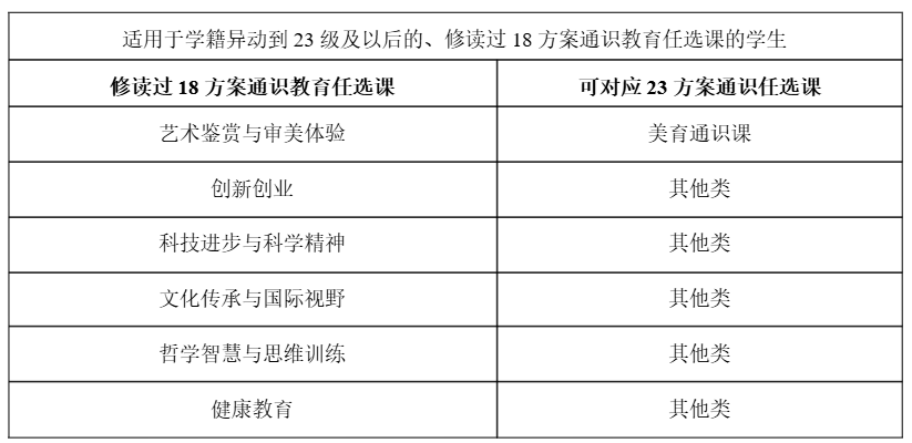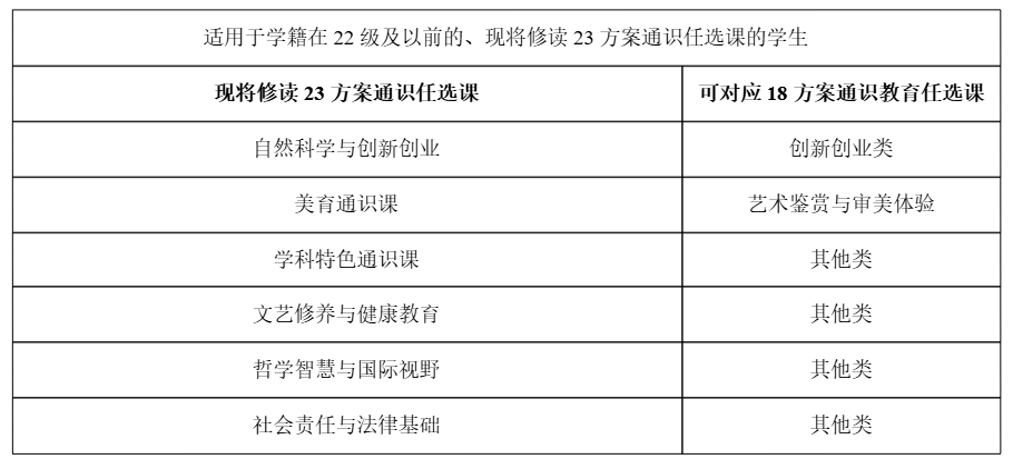情形二:原学籍在22级以前、现学籍异动到23级及以后的学生,现需修读23方案通识任选课,其曾经修读的18方案通识教育任选课可对应23方案通识任选课,对应关系详见表4。各位学生应仔细认真应仔细认真对照自己已修课程学分及模块与修读要求后进行选课。已经选修并通过的相同名称的课程不得再选。
