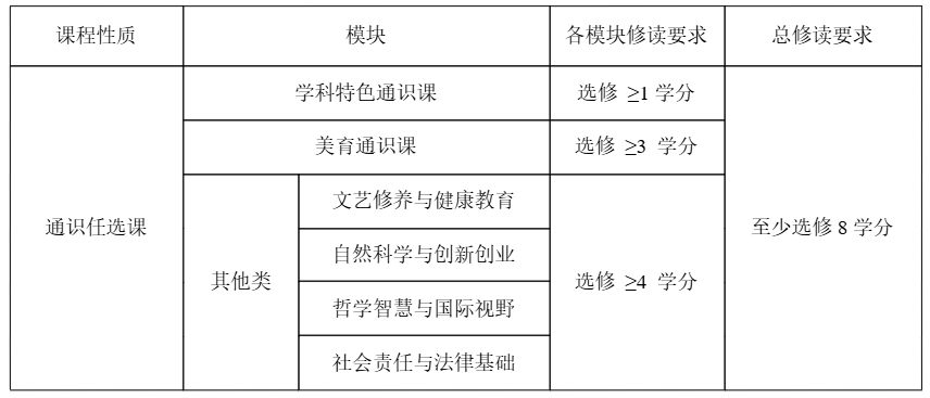 23级、24级和25级各专业学生总共须完成不少于8学分的23方案通识任选课,其中学科特色通识课模块至少1学分,美育通识课模块至少3学分,其他类别包括文艺修养与健康教育、自然科学与创新创业、哲学智慧与国际视野、社会责任与法律基础等模块共选修至少4学分(见表1);各位学生应仔细认真对照修读要求进行选课。