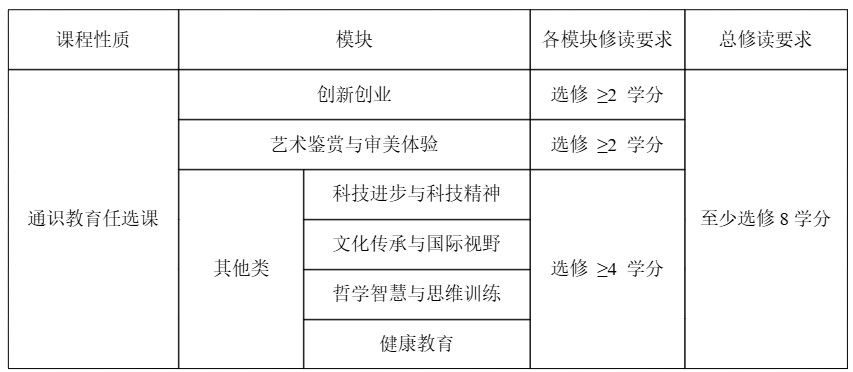 21级(五年制全日制)、22级各专业学生总共须完成不少于8学分的18方案通识教育任选课,其中创新创业模块至少2学分,艺术鉴赏与审美体验模块至少2学分,其他类别包括科技进步与科学精神、文化传承与国际视野、哲学智慧与思维训练、健康教育等模块共选修至少4学分(见表2);相应年级专转本、3+2专业学生至少应取得2个通识教育任选课学分,所选修课程类别不作结构性要求;各位学生应仔细认真对照修读要求进行选课。